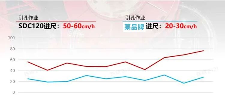 地层情况相同,引孔情况下作业实测,SDC120引孔作业进尺最高可达60cm/h,相当于2台某品牌双轮铣槽机作业。