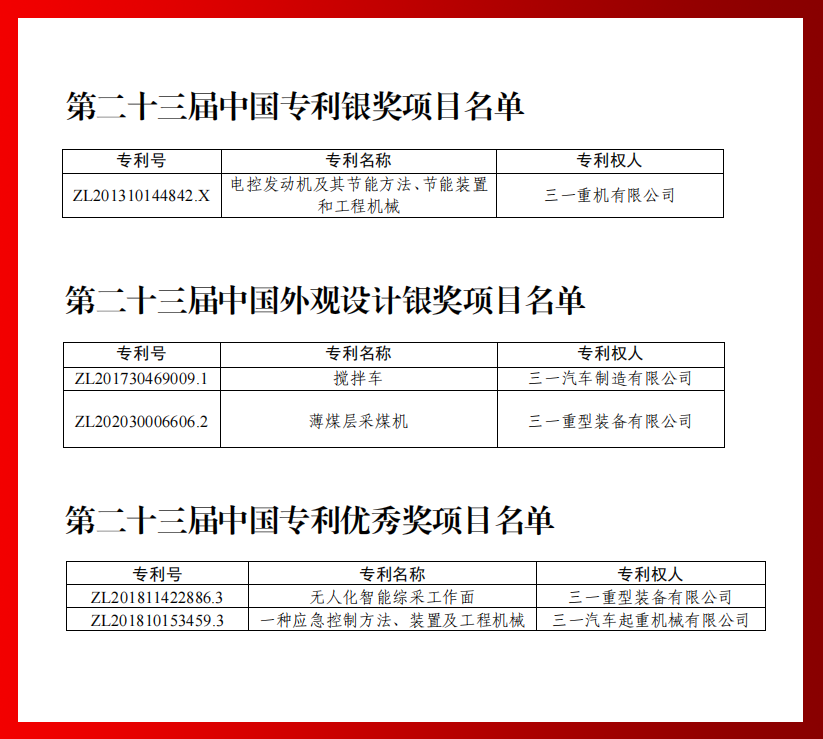 此次,好体育投注官网共有5项专利获奖,包括电控发动机及其节能方法、节能装置和工程机械(ZL201310144842.X)荣获中国专利银奖,搅拌车(专利号ZL201730469009.1)、薄煤层采煤机(ZL202030006606.2)荣获中国外观设计银奖,一种应急控制方法、装置及工程机械(ZL201810153459.3)、无人化智能综采工作面(ZL201811422886.3)获中国专利优秀奖。