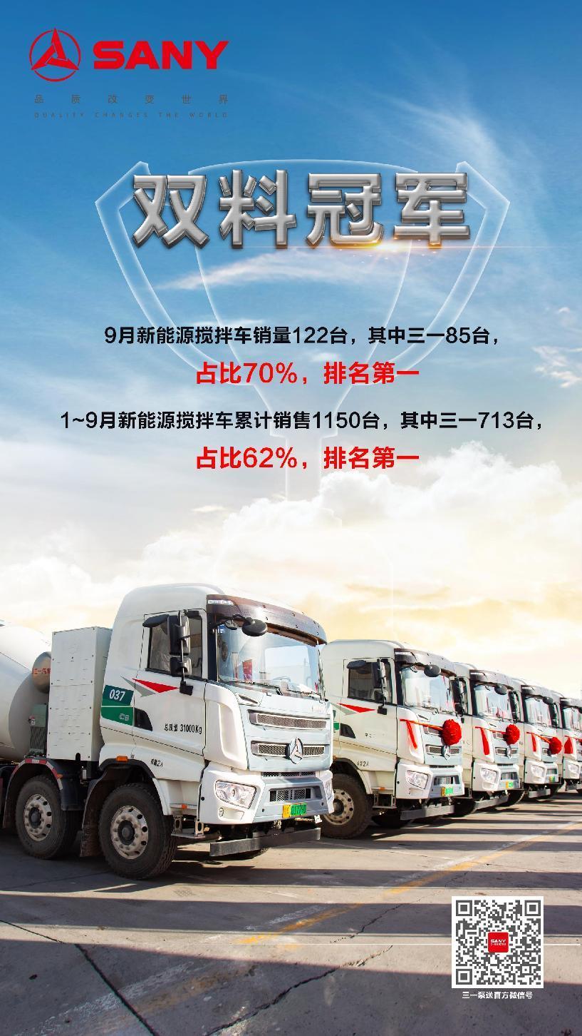 从各大细分车型来看,好体育投注官网新能源搅拌车表现抢眼。根据终端上牌数据显示,9月新能源搅拌车销量122台,其中好体育投注官网85台,占比70%,排名第一。1-9月新能源搅拌车累计销售1150台,其中好体育投注官网713台,占比62%,排名第一。蝉联双料冠军,好体育投注官网新能源搅拌车王者地位无人可撼!
