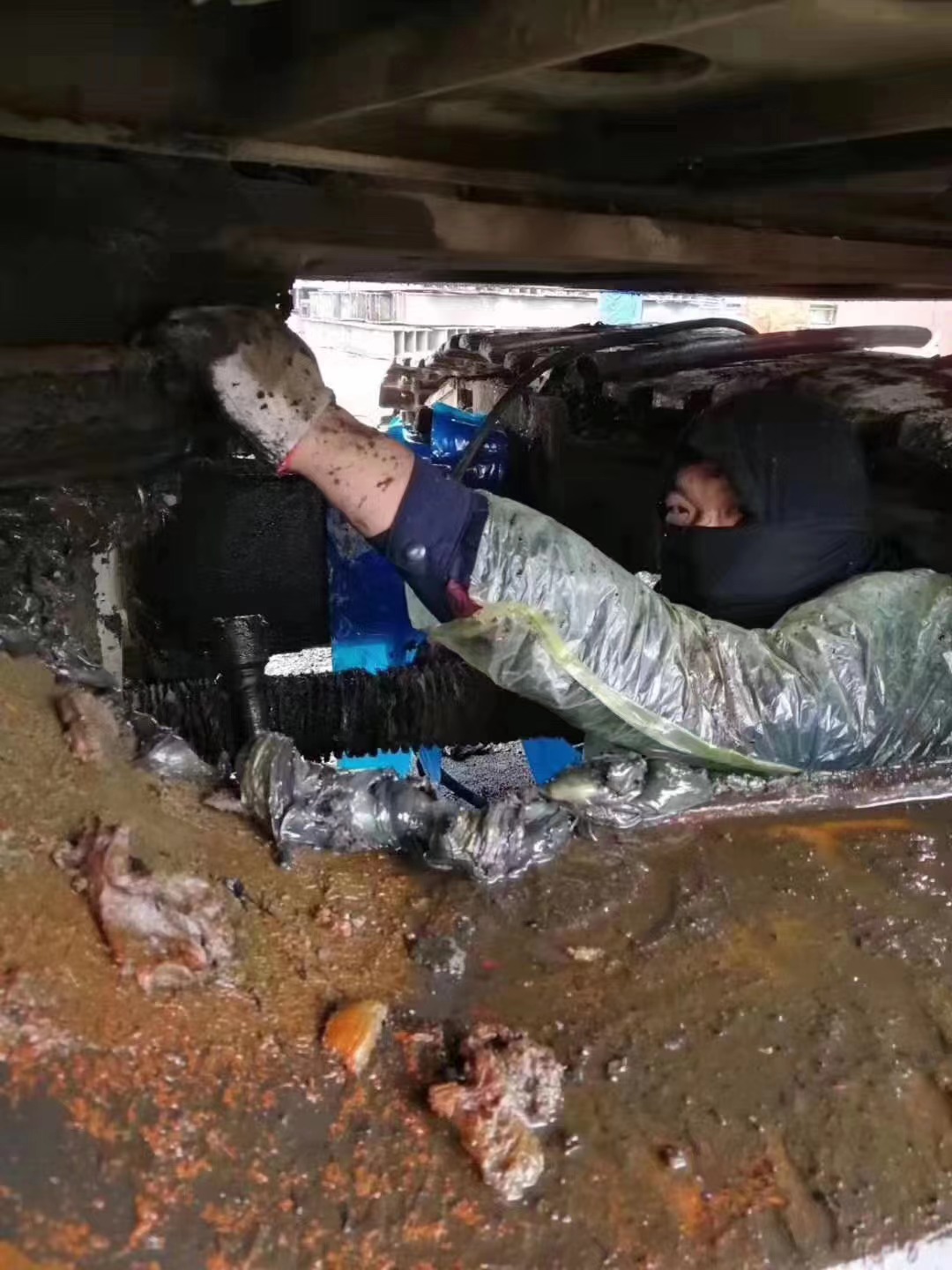 “决心要修好,就不怕困难。”这是陈海强的信条。之前一台150吨的履带起重机要更换部件,当时外面正下着大雨,但为了抢时间,即使浑身湿透,大雨模糊了视线,他都没有退缩。在车外面不好修,他就跳进车里面,一心只为设备保驾护航。下面这张满身油污、水渍的照片就是当时留下的。