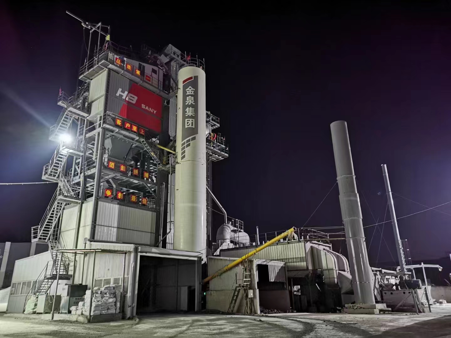 在施工后场,一台“大家伙”—— SLZ4000型一体机沥青搅拌站也正在源源不断地为前方施工供料。