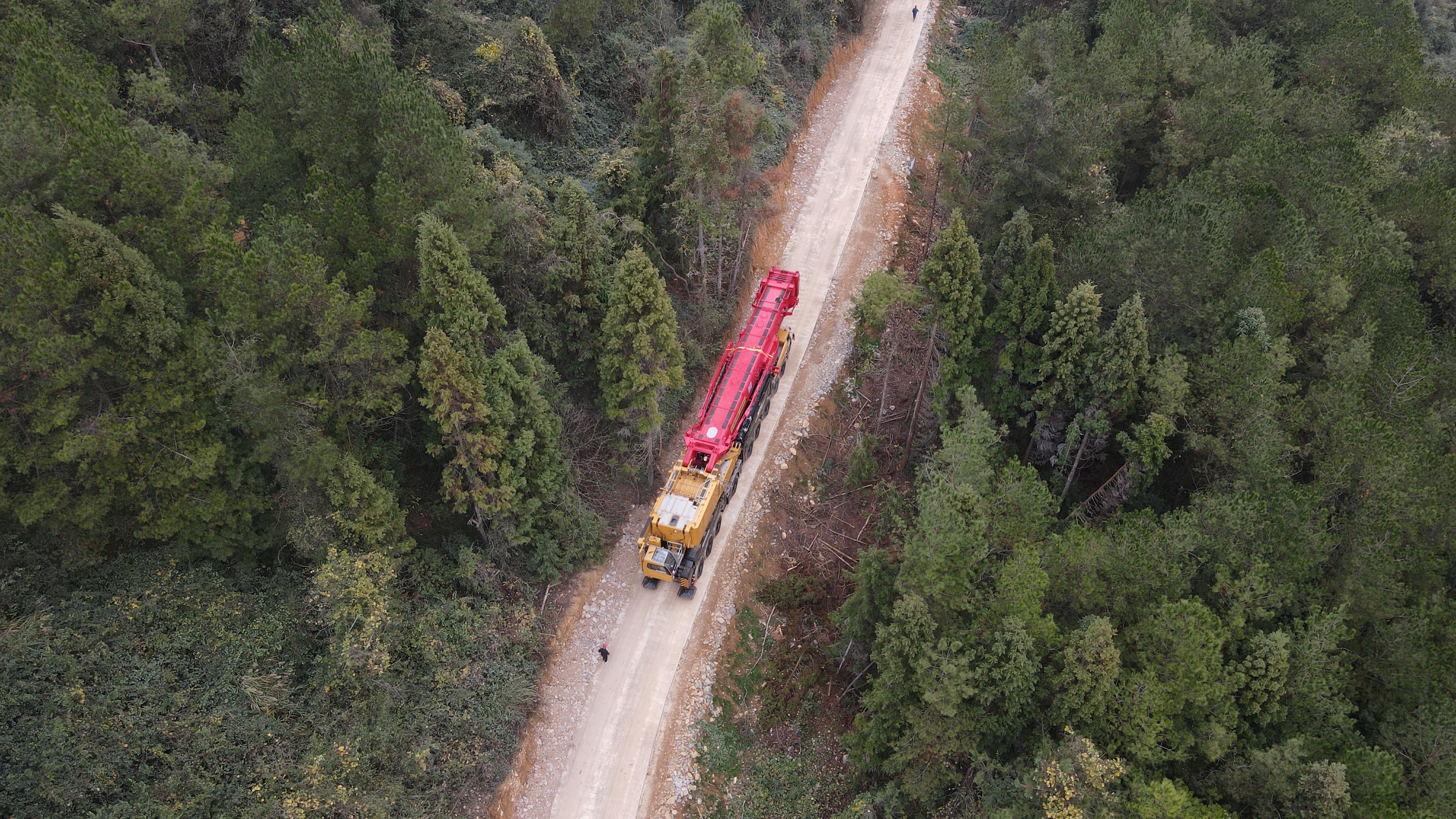 冬季的风场天气多变,且山地道路崎岖。为提高施工效率,这台2400吨以全臂全腿284吨的状态开始重载转场。转场路段全长4.3km,道路最大宽度4.5m,坡度15°。面对狭窄陡峭的山路,SAC24000T发挥稳定,顺利到达了下一个机位。