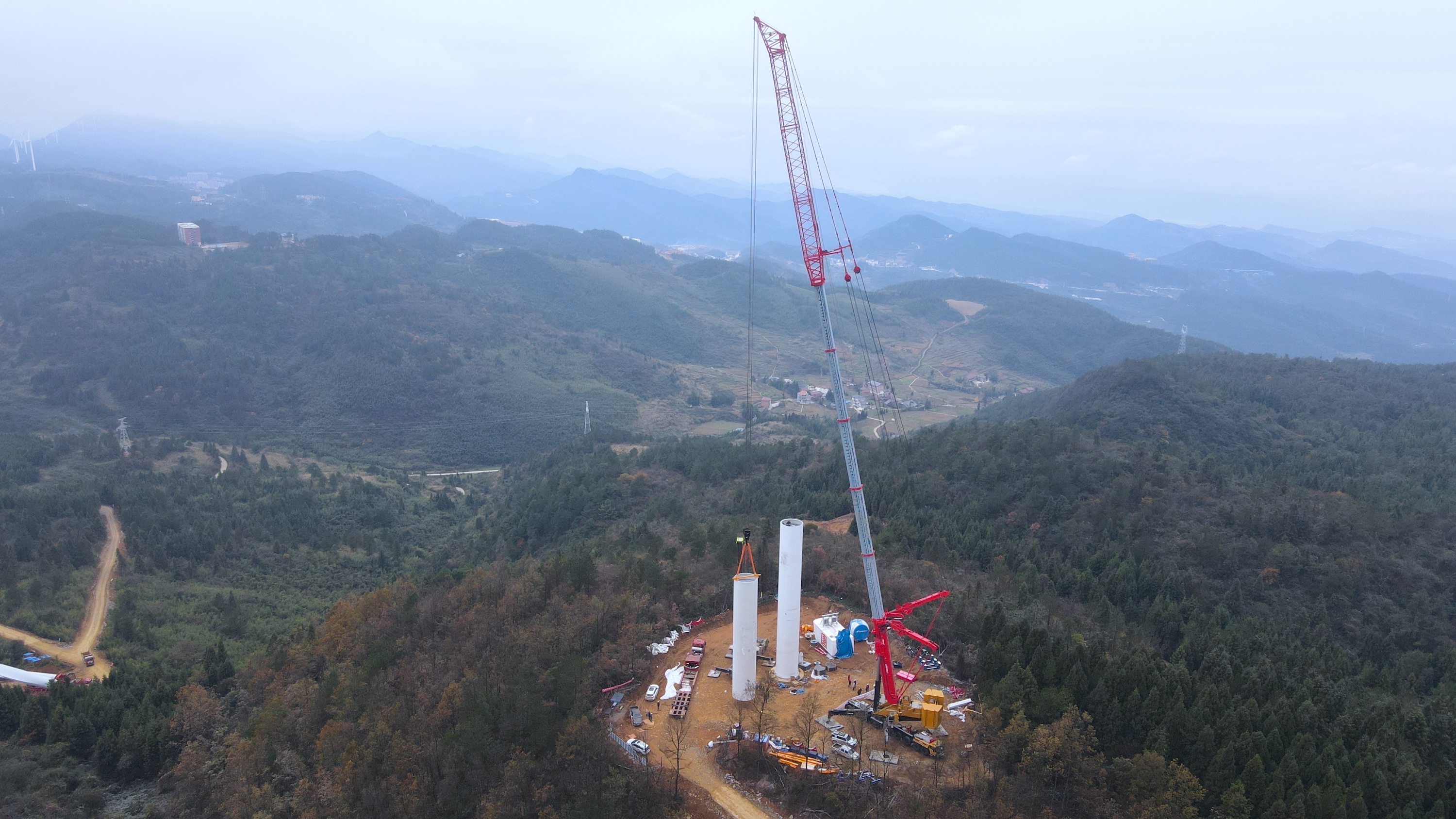 由于山地风电塔筒运输困难,加上天气条件较差,整整拖了10天才开始吊装第一、二节塔筒,吊载总重量分别为72.6t、81.6t。其实吊装当天风速并不理想,左侧达到5级,后方达到了6级,但大家都知道不能再等下去了。