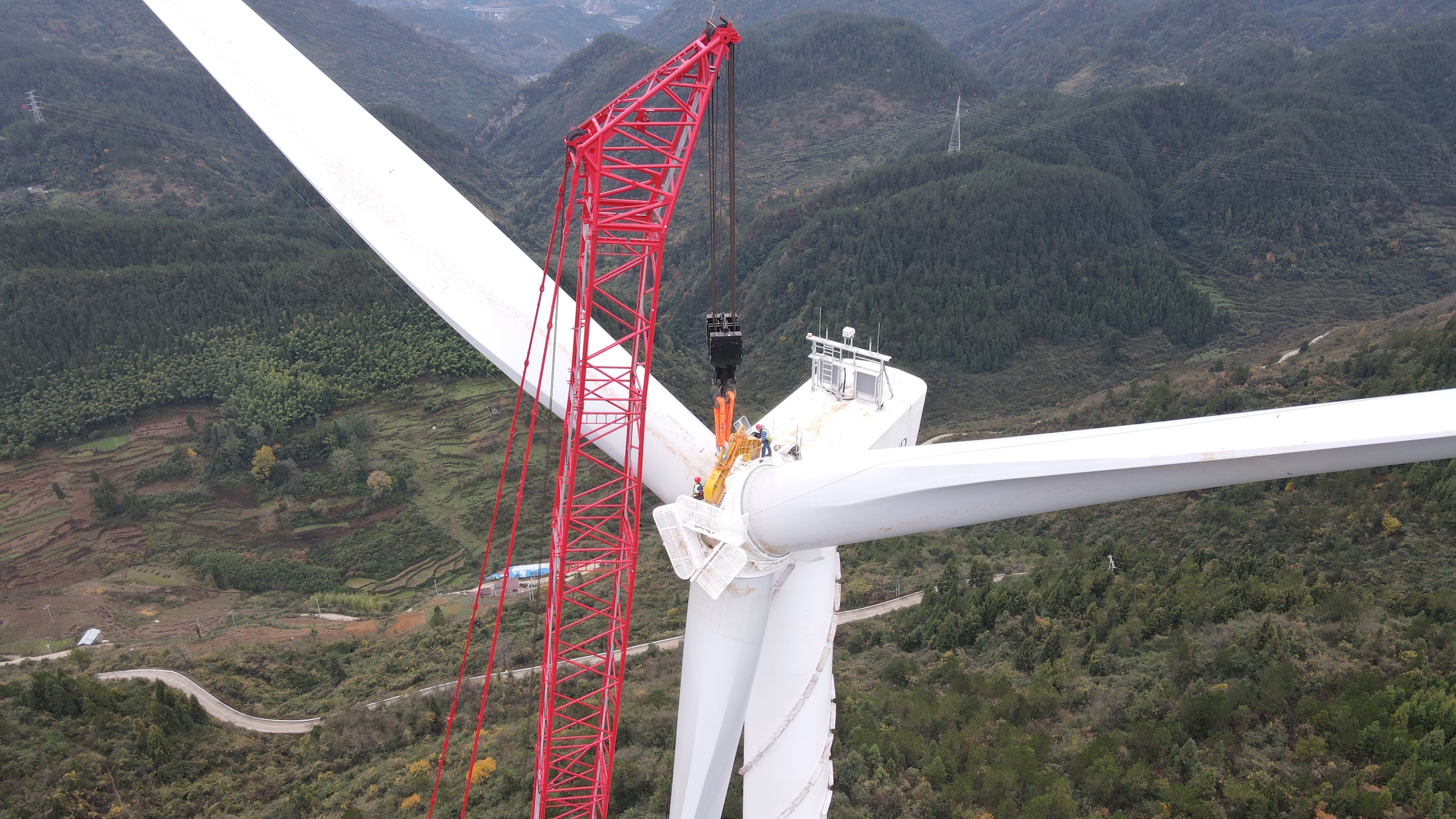 天气、风速适宜,随着地面指挥一声令下,SAC24000T立即起钩响应,仅耗时23分钟就将轮毂、叶片稳稳吊至121.8m高空。到达位置后再回转、起幅、落钩,与传动链进行对接,这个工位的吊装任务圆满完成。
