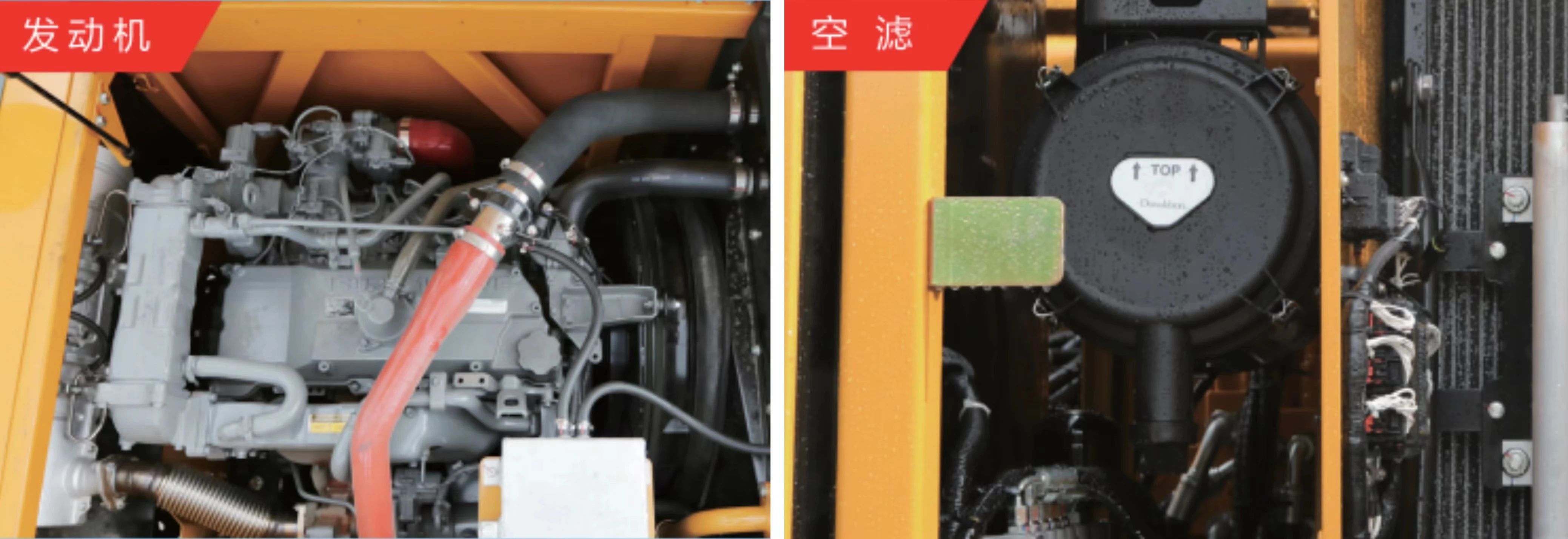 搭载进口发动机,额定功率128.4kW,相较于国三功率提升8kW,充足的功率储备确保机器在恶劣工况下工作的可靠性。采用11寸大尺寸带MAF传感器座的空滤,纳米滤芯,大容灰量设计,过滤效率可达 99.99%,确保空气充足干净,减少缸件磨损,延长使用寿命。