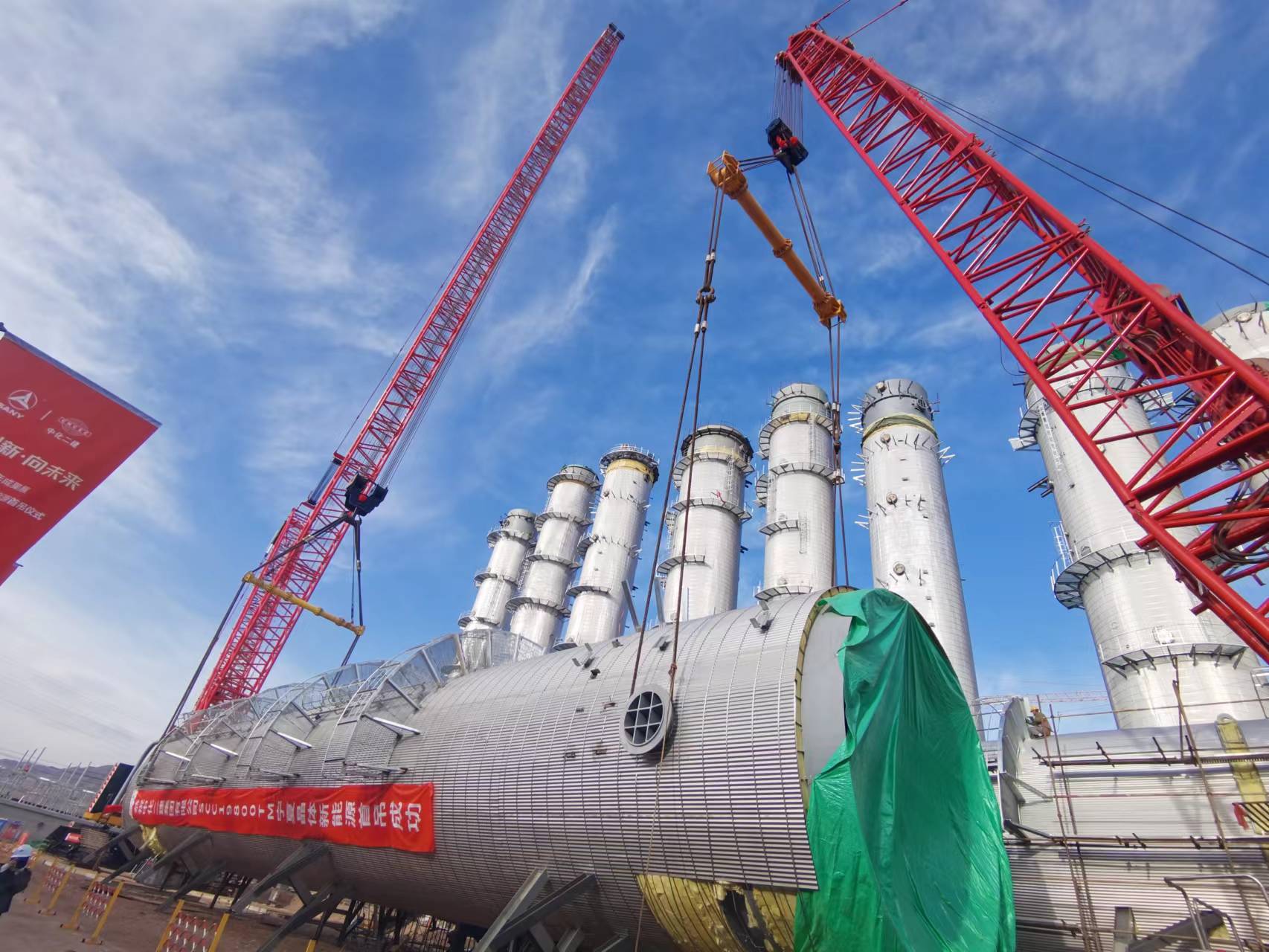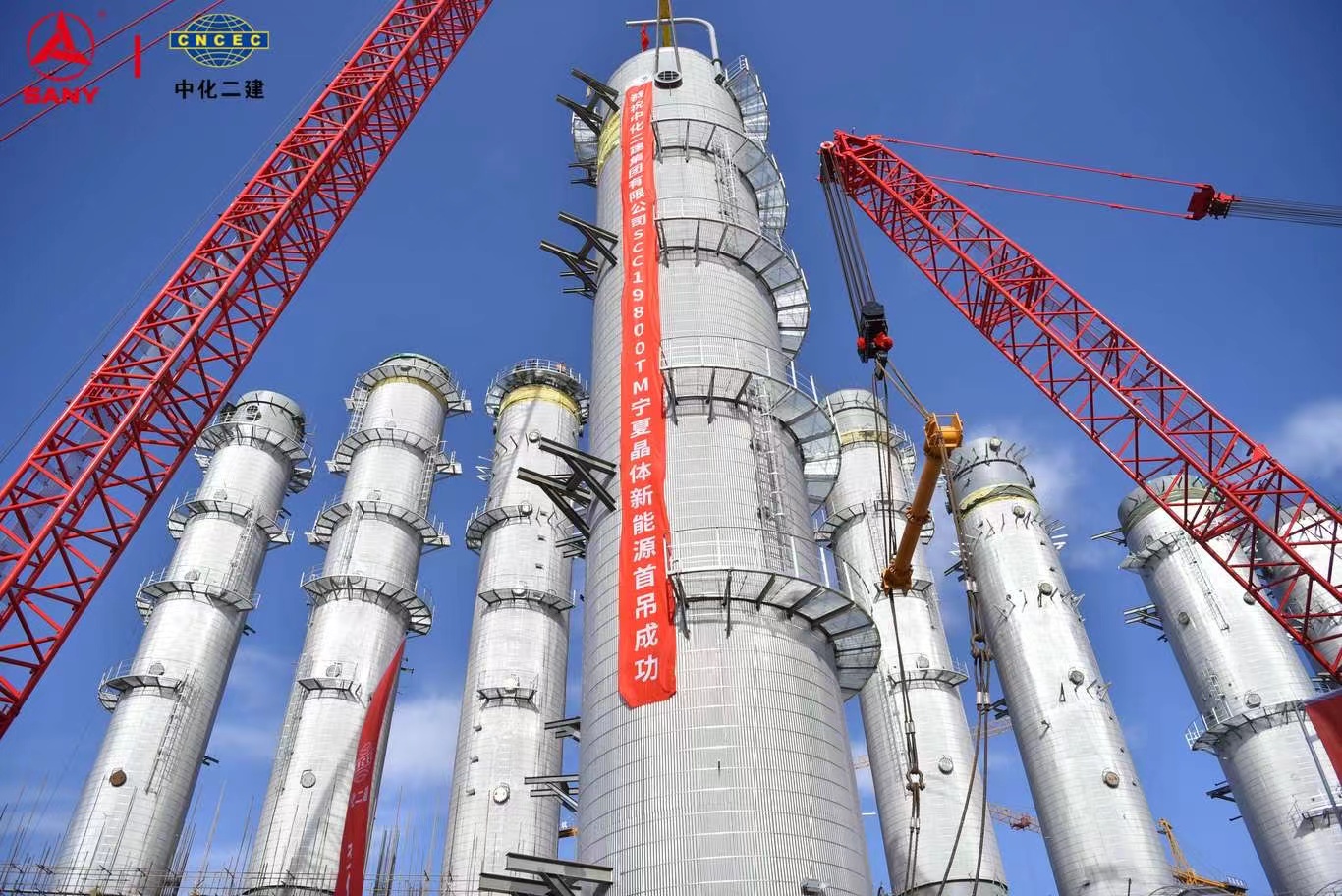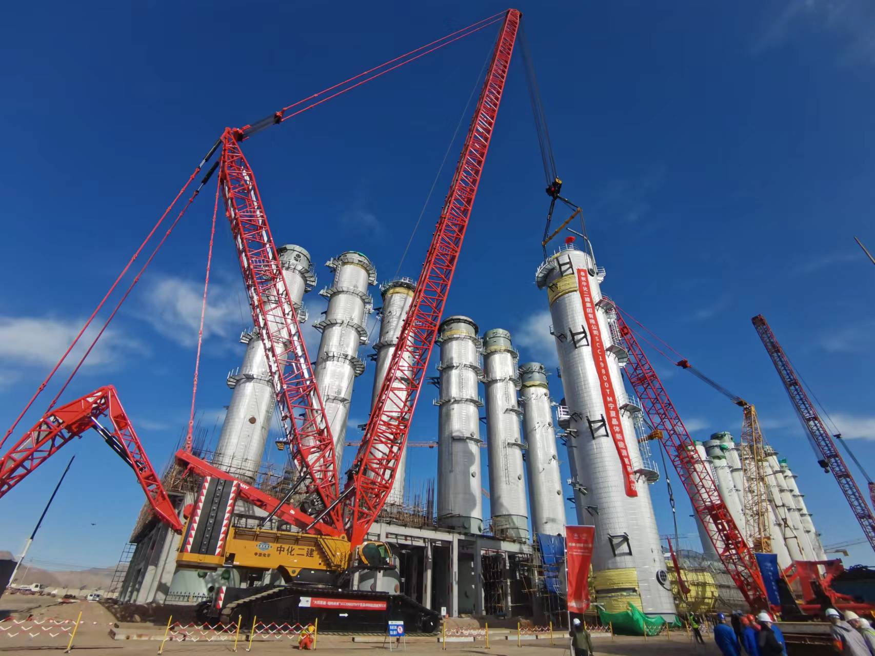 宁能年产12.5万吨多晶硅项目现场,中化二建集团有限公司的SCC19800TM顺利将T0304AB精馏塔上段竖起。来自全国石油化工单位、头部吊装企业的150余位嘉宾共同见证。