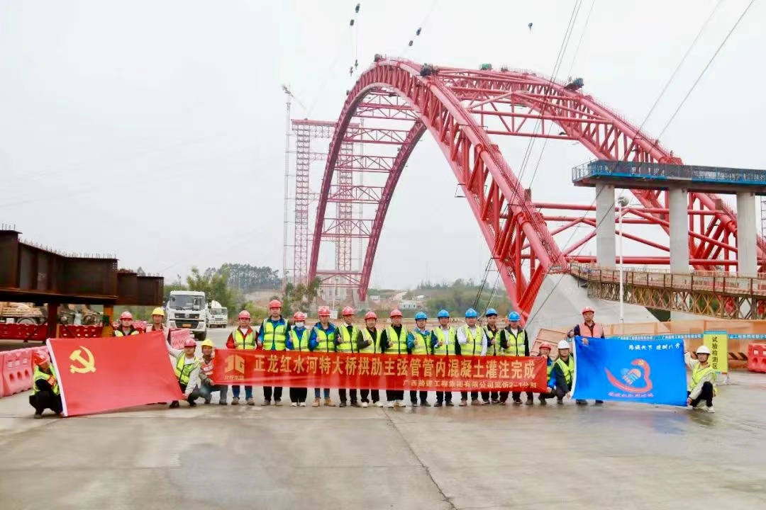 红水河面架飞虹,跨连青山越苍穹。3月14日晚,正龙红水河特大桥的最后一根拱肋主弦管管内混凝土完成灌注。至此,全桥拱肋主弦管全部完成灌注施工。