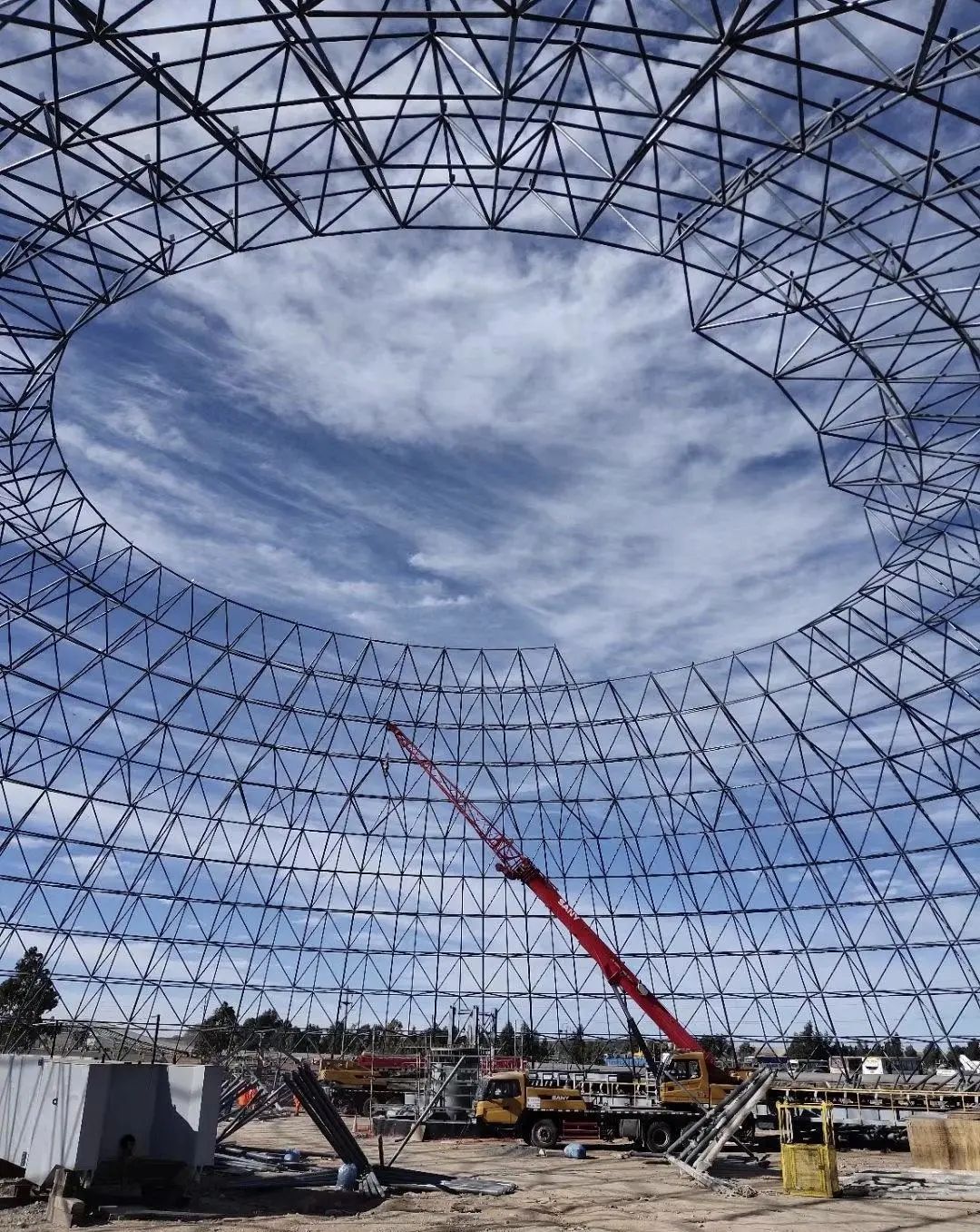 蔚蓝的天空中云彩如织,一台25吨起重机正在演陂水泥厂奋力施工中,一个巨大的网状结构缓缓成型。