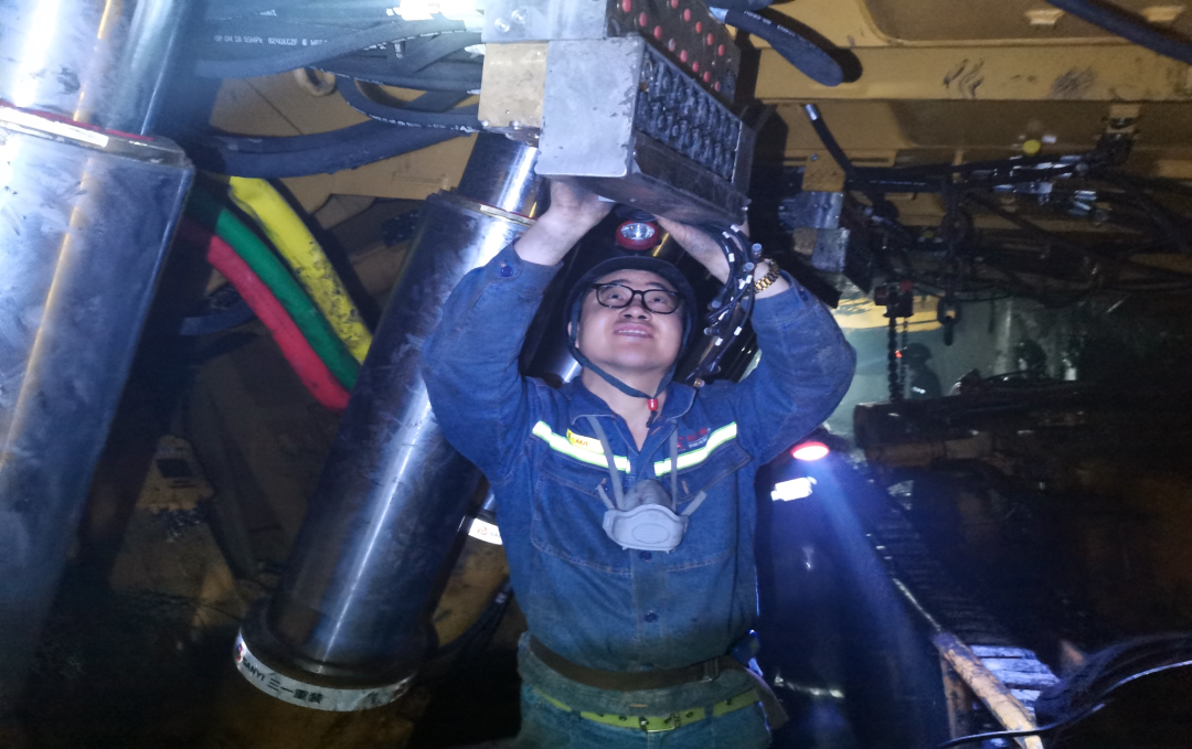 在百米深的井下,工程师正在给液压支架安装电液控,项目进展顺利,他的脸上露出了满足的笑容。