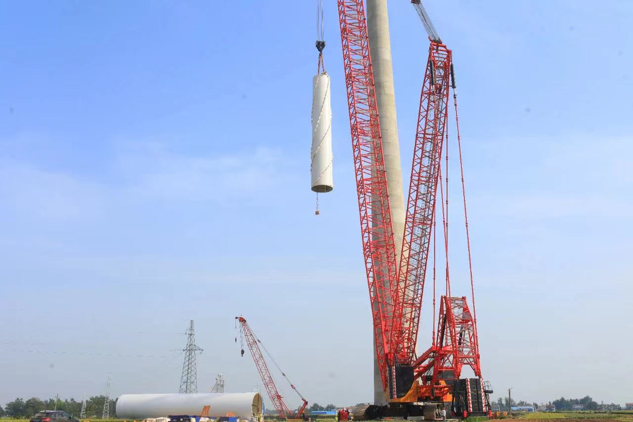 今年4月初,位于河南省开封市的杞县平煤北控32MW分散式风电项目,要新建4台5.0MW机组和3台4.0MW机组以及1座35KV开关站。好体育投注官网SCC17000TM-1履带起重机负责该项目内全部7台风机的安装工作。此次施工,SCC17000TM-1采用168m增强主臂+12m风电副臂工况,超起配重520t,超起半径32m,承担主吊任务。