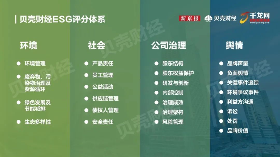 贝壳财经ESG评价体系根据上市公司公开信息和舆情风险暴露情况对民营上市公司主体进行评价,综合参考E(环境)、S(社会)、G(治理)以及舆情(public opinion)等一级指标,综合反映企业ESG治理和ESG风险情况,筛选民营企业优质范例,助力民营企业加强ESG信息披露和实践。