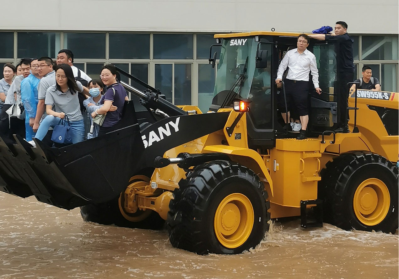 趟过泥泞,绕过湍流,清除障碍,救援队艰难前行,利用装载机护送受困群众的同时,前往积水更深、更远的周边地区,不停大声呼喊着失联人员的名字,直到最后一名居民安全转移。