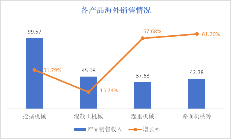 分产品看,公司主要产品海外销售均实现快速增长,挖掘机械99.57亿元,同比增长31.79%;混凝土机械45.08亿元,同比增长13.74%;起重机械37.63亿元,同比增长57.68%;路面机械等其他产品42.38亿元,同比增长61.2%。