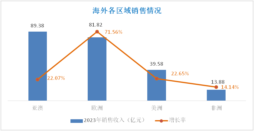 分区域看,公司海外产品销售已覆盖180多个国家与地区,欧美为海外增长最快的区域。各区域实现销售收入情况如下:亚澳区域89.38亿元,增长22.07%;欧洲区域81.82亿元,增长71.56%;美洲区域39.58亿元,增长22.65%;非洲区域13.88亿元,增长14.14%。