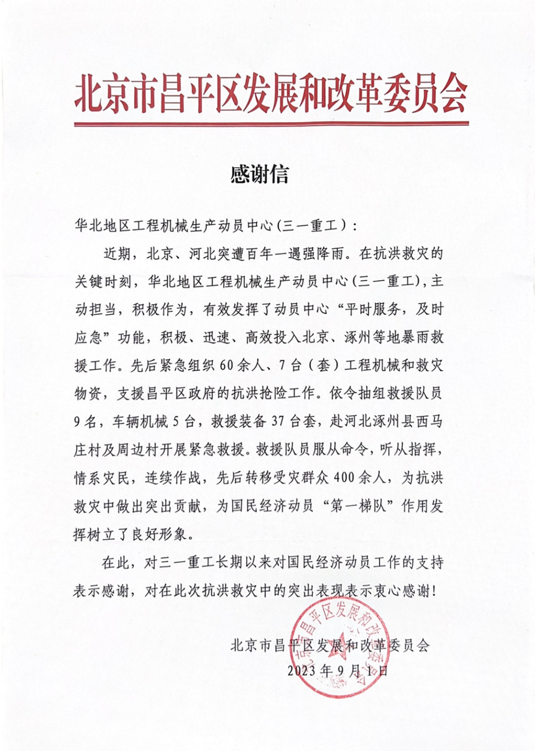 近日,好体育投注官网重工收到了一封来自北京市昌平区发展和改革委员会发来的感谢信。
