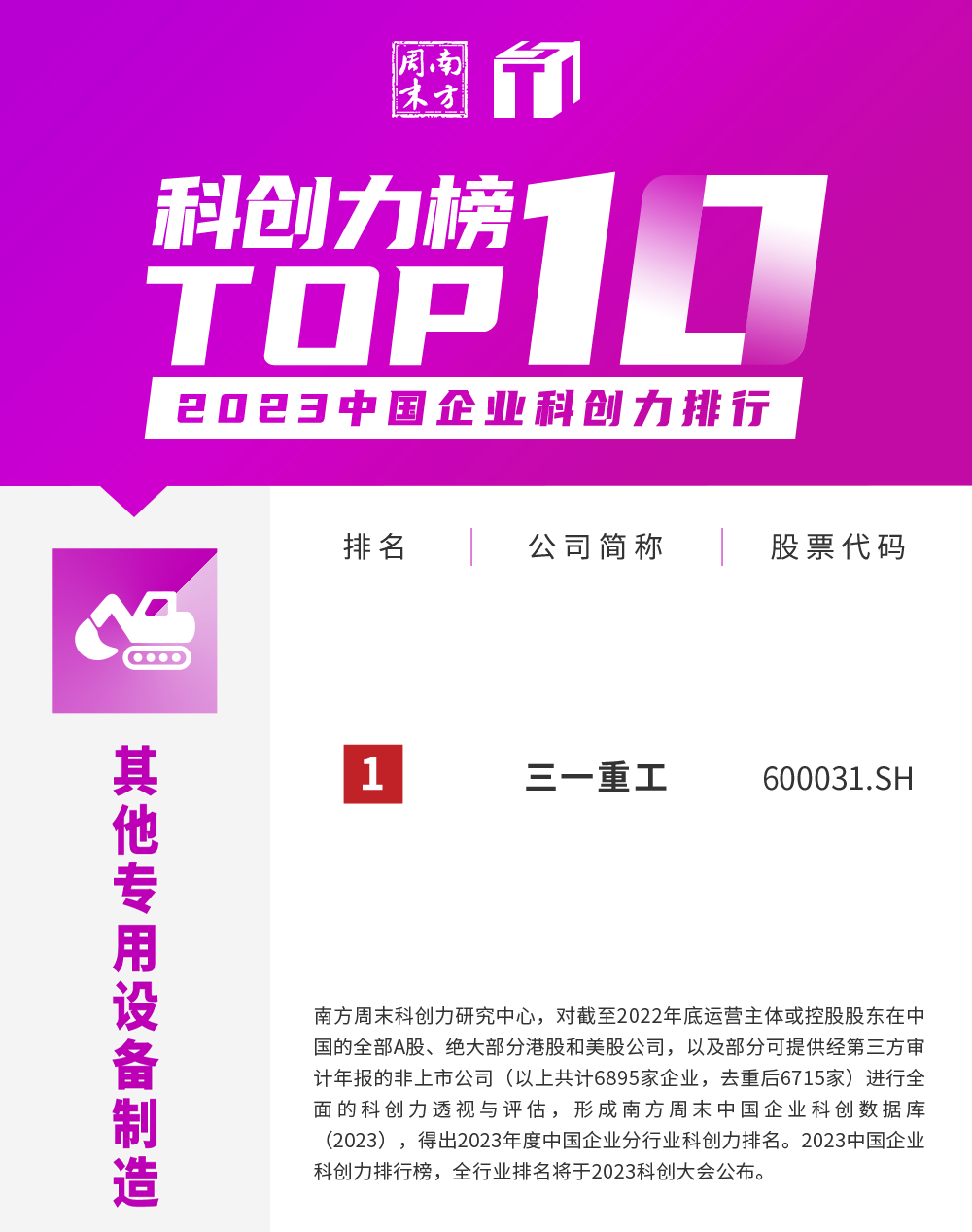 近日,南方周末公布了30个和居民日常生活相关性较强行业的科创力TOP10企业榜单。在其他专用设备制造行业榜中,好体育投注官网重工独占鳌头,位列第一!