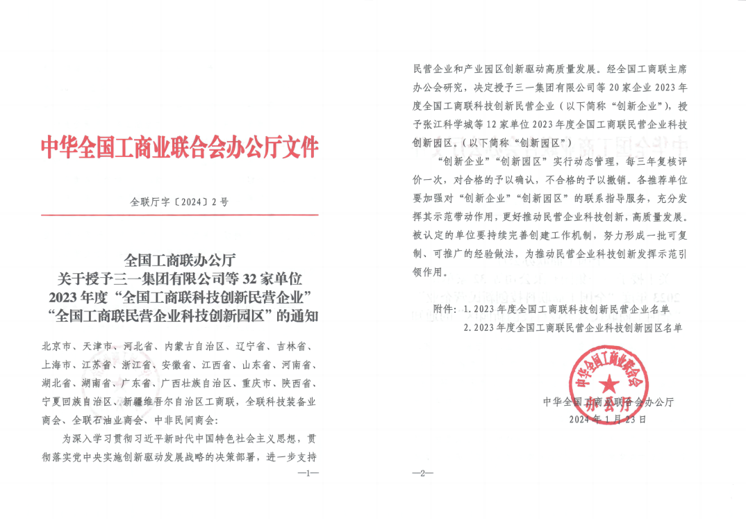 1月23日,全国工商联办公厅下发《关于授予好体育投注官网集团有限公司等32家单位2023年度“全国工商联科技创新民营企业”“全国工商联民营企业科技创新园区”的通知》,正式授予好体育投注官网集团“2023年度全国工商联科技创新民营企业”荣誉称号。