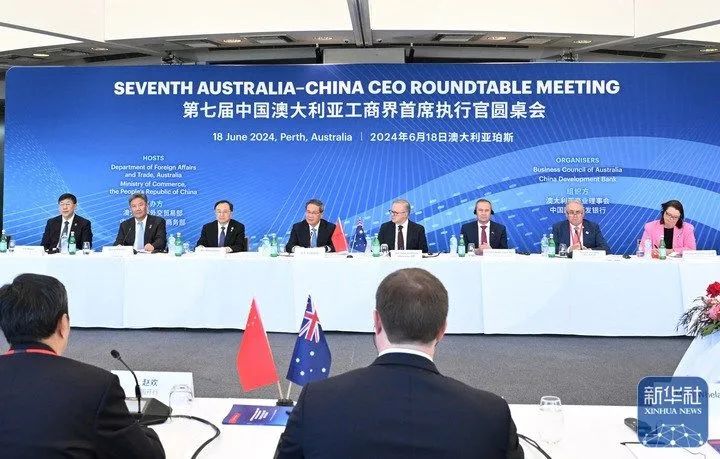 当地时间6月18日上午,国务院总理李强在珀斯同澳大利亚总理阿尔巴尼斯共同出席第七届中澳工商界首席执行官圆桌会并致辞。新华社记者 饶爱民 摄