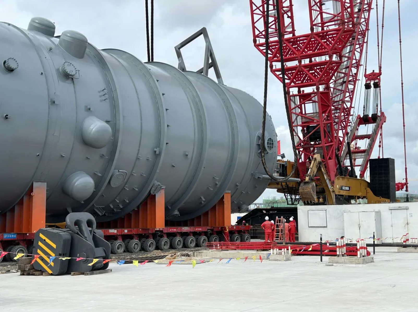 SCC20000A完成项目特大型塔器的首吊任务。将高83.65米、直径6米、单体重417吨的C-620第二粗苯乙烯塔一次吊装成功,吊装重量758吨,为项目的首次大件重型设备吊装立下了“头功”。