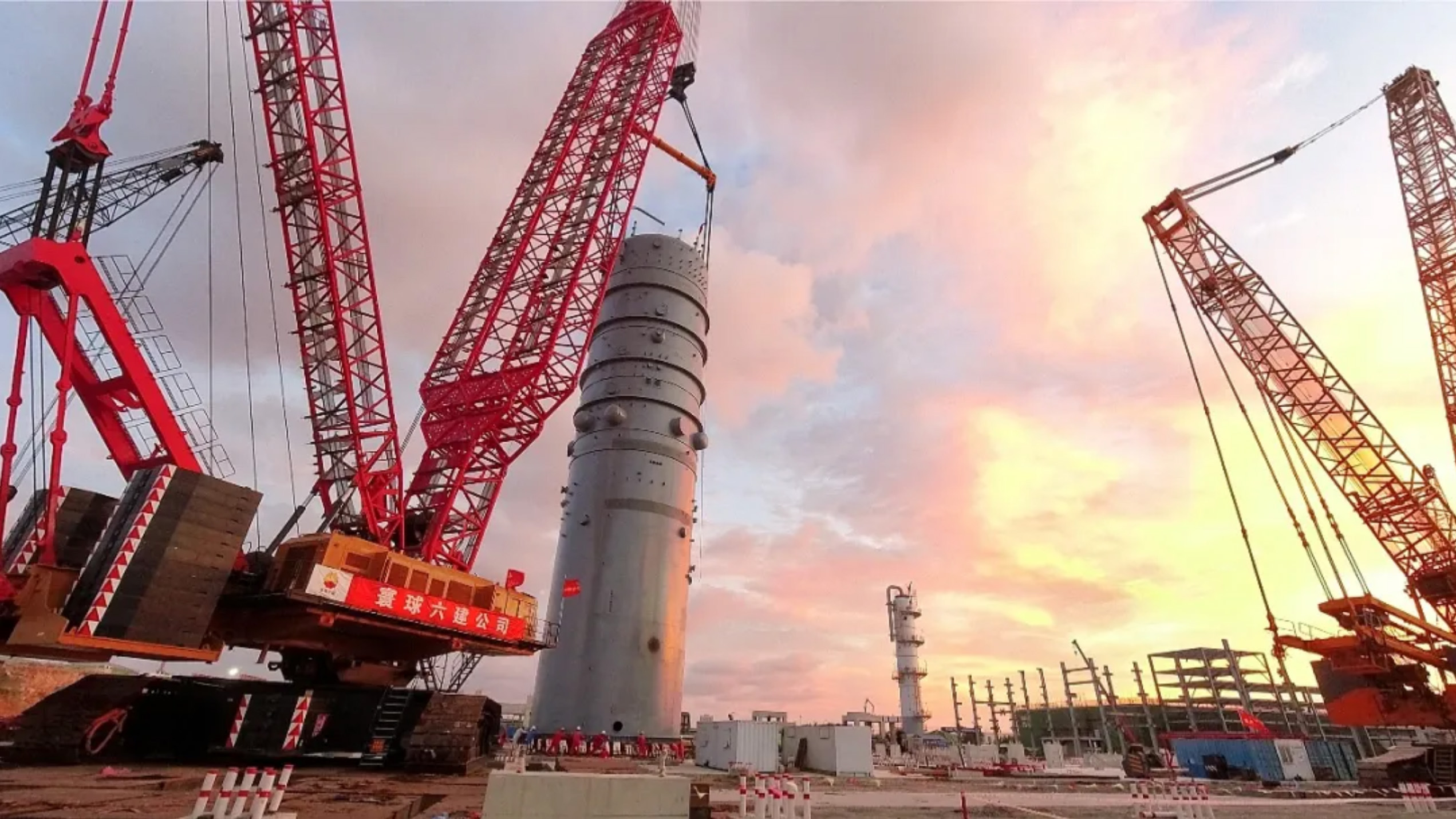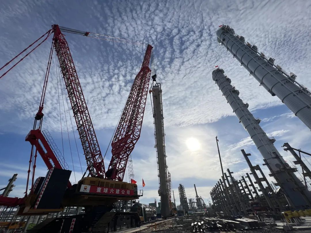 14天,完成4座高度超过80米的特大型塔器吊装。除此之外,7月7日还完成了C-0360脱乙烷塔、C-0450解吸塔器吊装,一天两吊,充分体现了广西石化炼化一体化项目团队在大型吊装上丰富的计划、组织、现场管理经验。