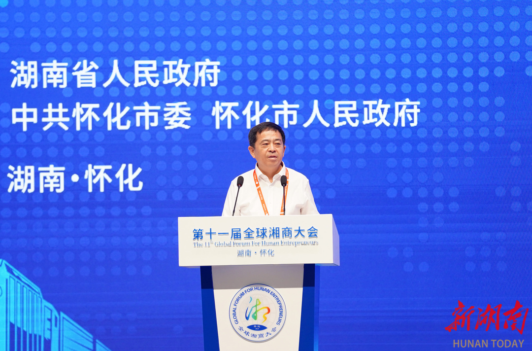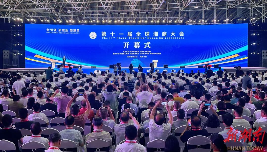 9月13日上午,第十一届全球湘商大会在怀化国际会展中心开幕。本届大会以“新引领 新高地 新篇章”为主题,由中共湖南省委、湖南省人民政府主办;湖南省工商联、湖南省商务厅、中共怀化市委、怀化市人民政府承办。来自世界各地的湘商代表、院士专家、知名民营企业家代表等近1000名嘉宾齐聚鹤城,共叙乡情、共谋发展。