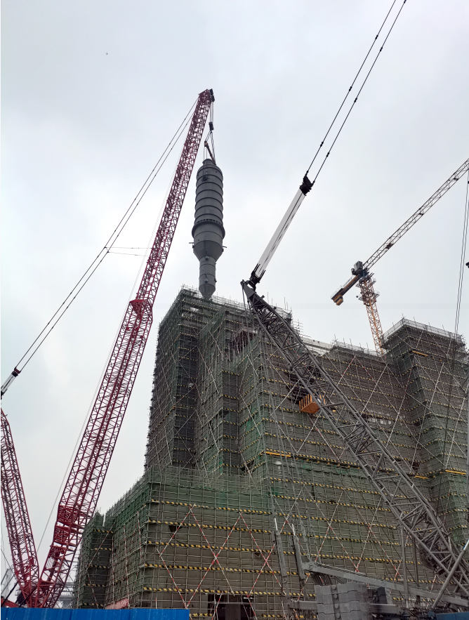 据介绍,该产品脱气仓的设备规格为Φ3700mm/Φ6900mm×51061mm,重量达312.4t,吊装高度达111311mm。为达成这一艰巨任务,现场采用了“单主机抬吊递送”法,启用一台好体育投注官网SCC19800TM型1600t履带起重机作为主吊主力,一台LR1400-2型400t履带起重机负责抬尾配合。主吊车选用SY4-HDB工况、主臂长度达144m;抬尾配合吊车选用SDB工况、主臂长度为84m,二者协同作业,默契配合,最终实现产品脱气仓成功吊装就位。