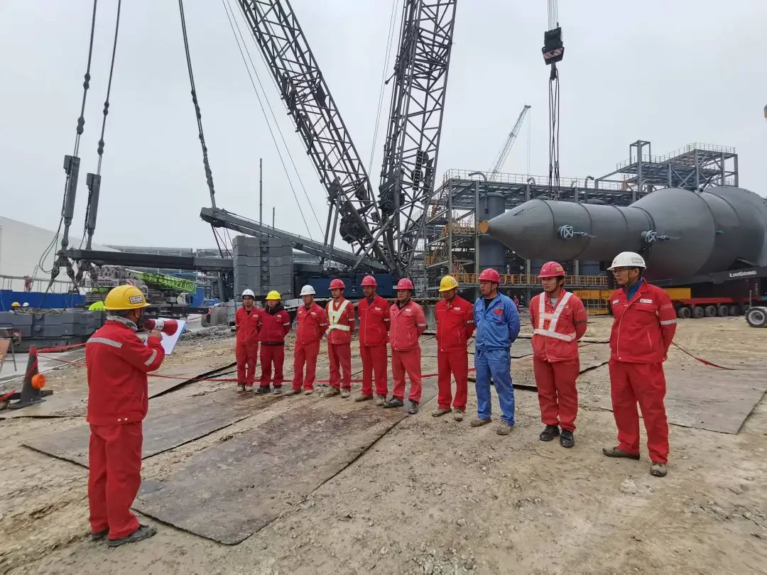 据了解,此次的吊装作业面临重重挑战。现场施工单位众多,空间受限,车辆转场困难,尤其是车辆组装、扳起场地狭小等不利条件,为此次吊装增添了显著难度。
