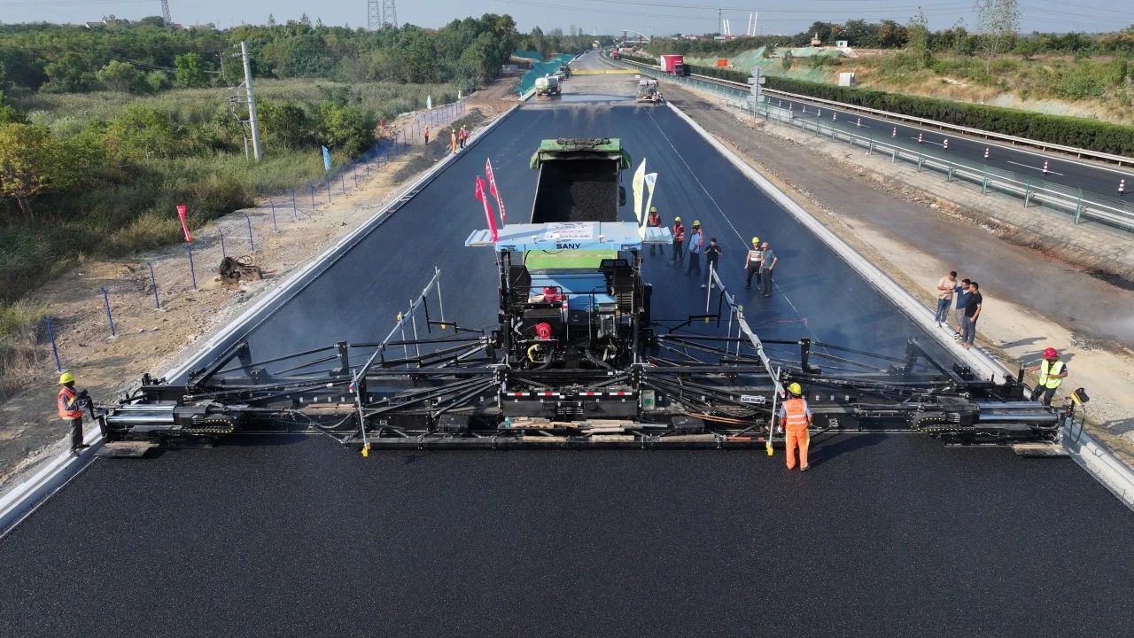 在湖北孝感京港澳改扩建项目中,该摊铺机实际施工中以19.25米的摊铺宽度实现了一次性摊铺成型,这在国内乃至国际道路建设领域皆为首次。
