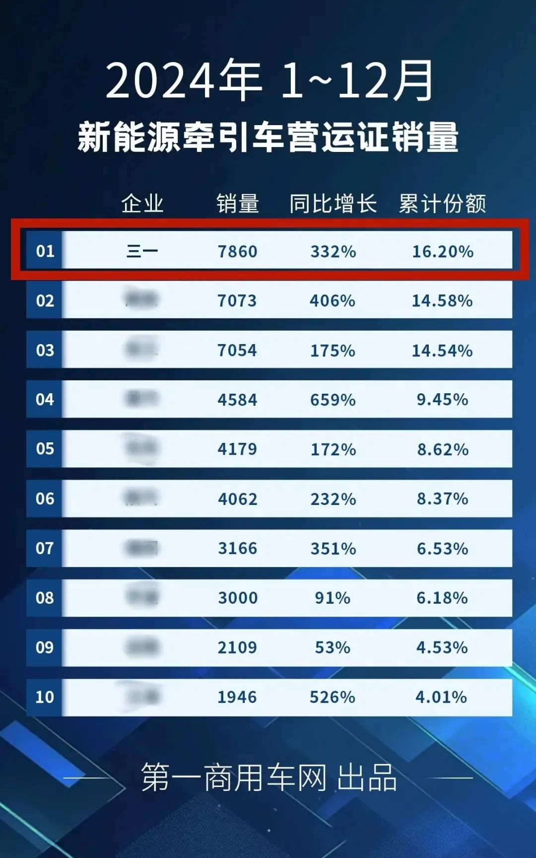 据最新北斗数据:2024年好体育投注官网重卡牵引车实销7860辆,同比增长332%,累计份额16.2%,在年度销量争夺战中问鼎销冠!领跑市场!