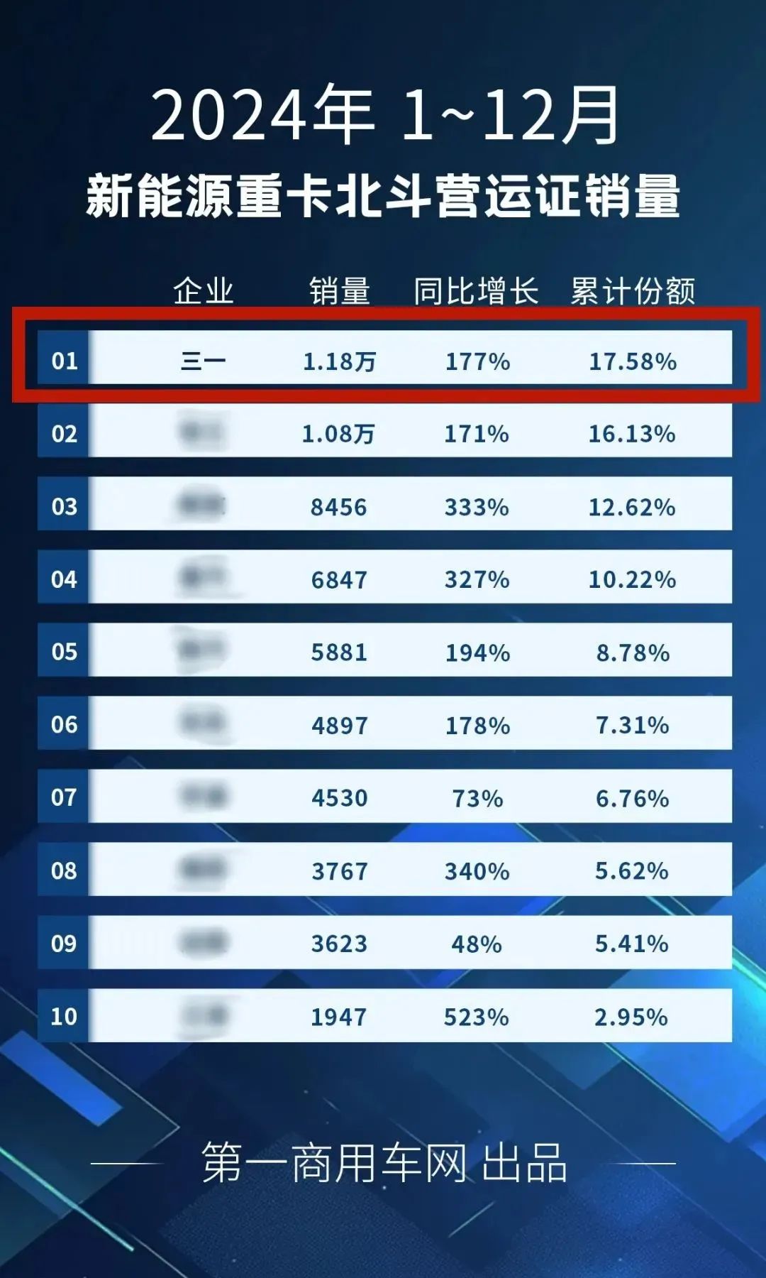 2024年,好体育投注官网以全年累计11800辆销量稳坐中国新能源重卡销量第一宝座,同比增长177%,再夺年度销冠!