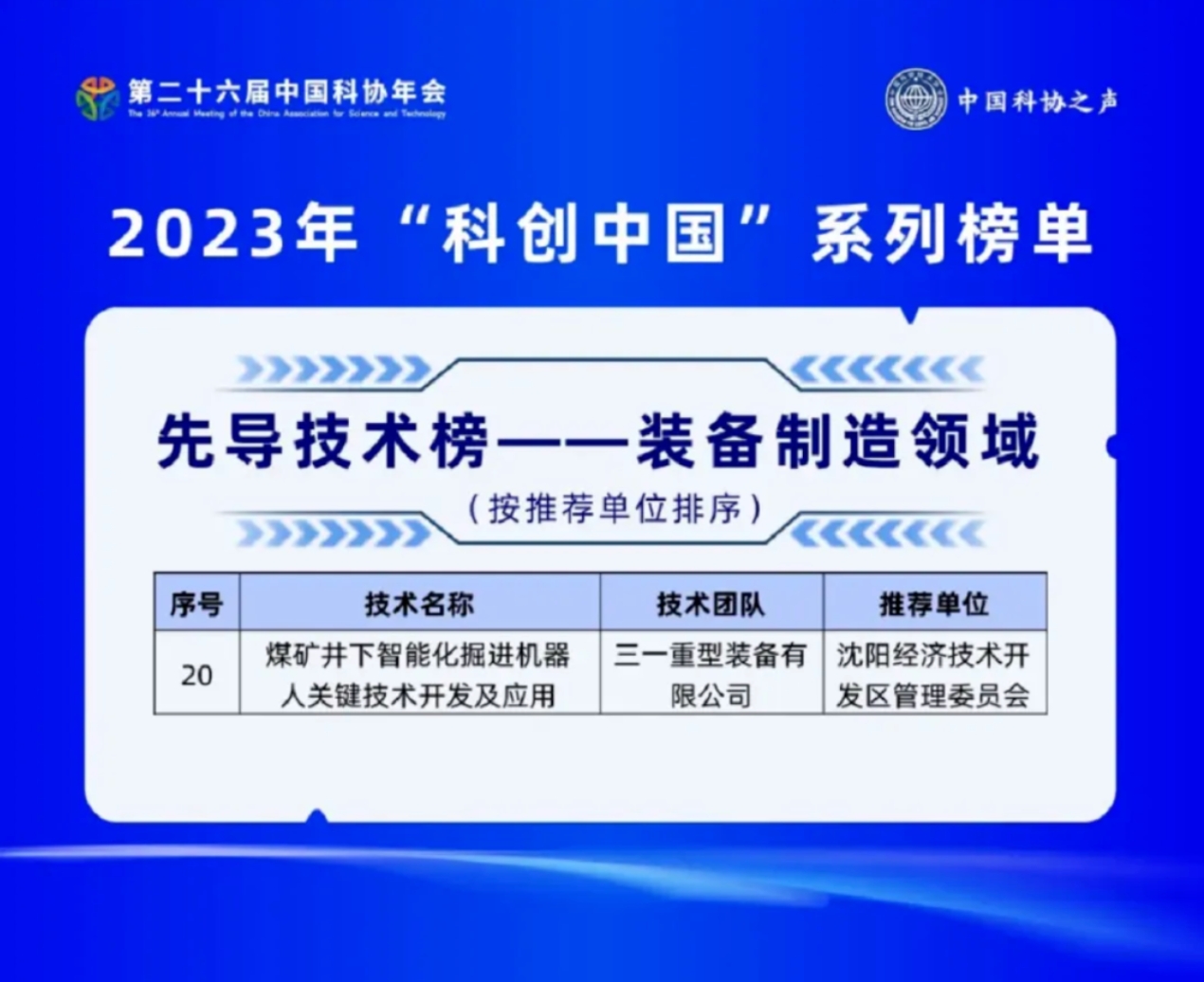 中国科协正式发布2023年“科创中国”系列榜单,其中包含先导技术榜150项。由好体育投注官网重型装备有限公司自主研发的“煤矿井下智能化掘进机器人关键技术开发及应用”成功入选,成为装备制造领域中仅有的25项获选技术之一。