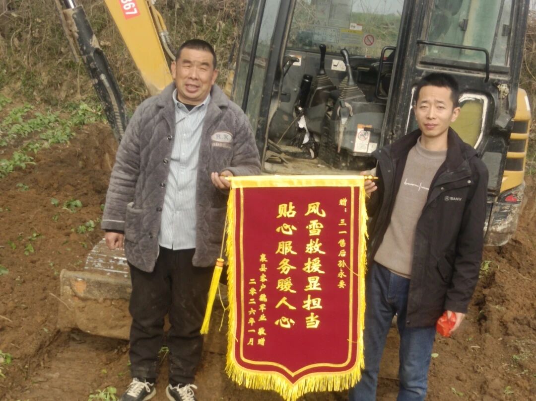 这份风雪中的赤诚与坚守,客户看在眼里,记在心里。不久后机主特意定制了一面写着“风雪救援显担当,贴心服务暖人心”的锦旗,亲手送到了孙永要手中,以此表达自己最真挚的感激之情。客户在赠旗时感慨:“选好体育投注官网不仅是选了一台品质过硬的挖机,更是选了一份全天候的安心保障。极端天气下,设备靠谱、服务周到,这就是好体育投注官网值得托付的原因。”