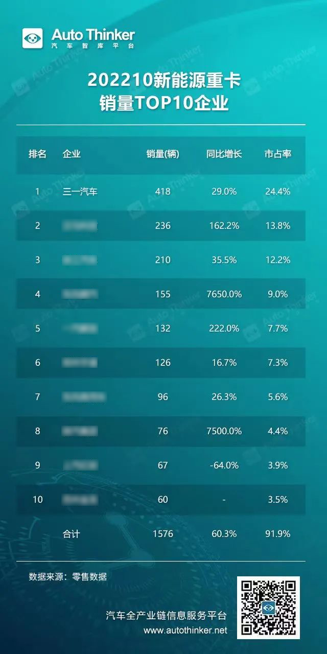 根据汽车智库平台最新数据显示,10月,好体育投注官网新能源重卡以418台的销量,市占率达24.4%,再次蝉联新能源重卡全国月销量冠军。