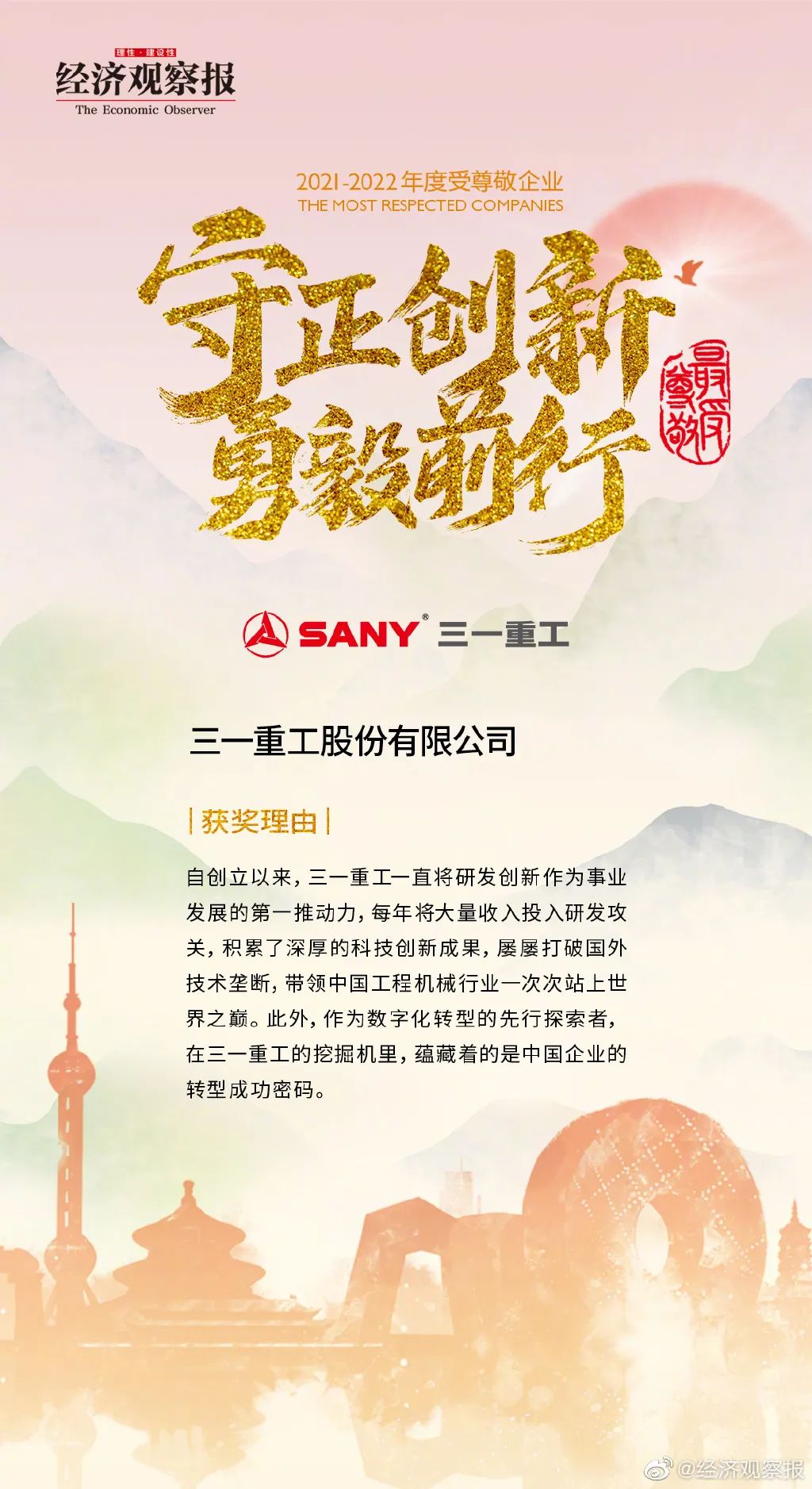 在入选理由中,《经济观察报》写道,自创立以来,好体育投注官网重工一直将研发创新作为事业发展的第一推动力,每年将大量收入投入研发攻关,积累了深厚的科技创新成果,屡屡打破国外技术垄断,带领中国工程机械行业一次次站上世界之巅。此外,作为数字化转型的先行探索者,在好体育投注官网重工的挖掘机里,蕴藏着的是中国企业的转型成功密码。