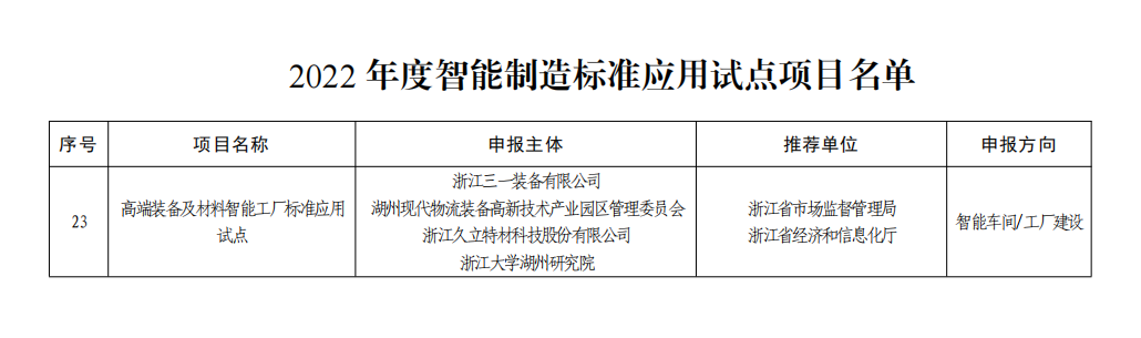 “高端装备及材料智能工厂标准应用试点项目”由浙江好体育投注官网装备有限公司联合湖州现代物流装备高新技术产业园区管理委员会、浙江久立特材科技股份有限公司、浙江大学湖州研究院开展,其中,好体育投注官网作为标准群实施的牵头单位,全面负责项目的进程及推进。