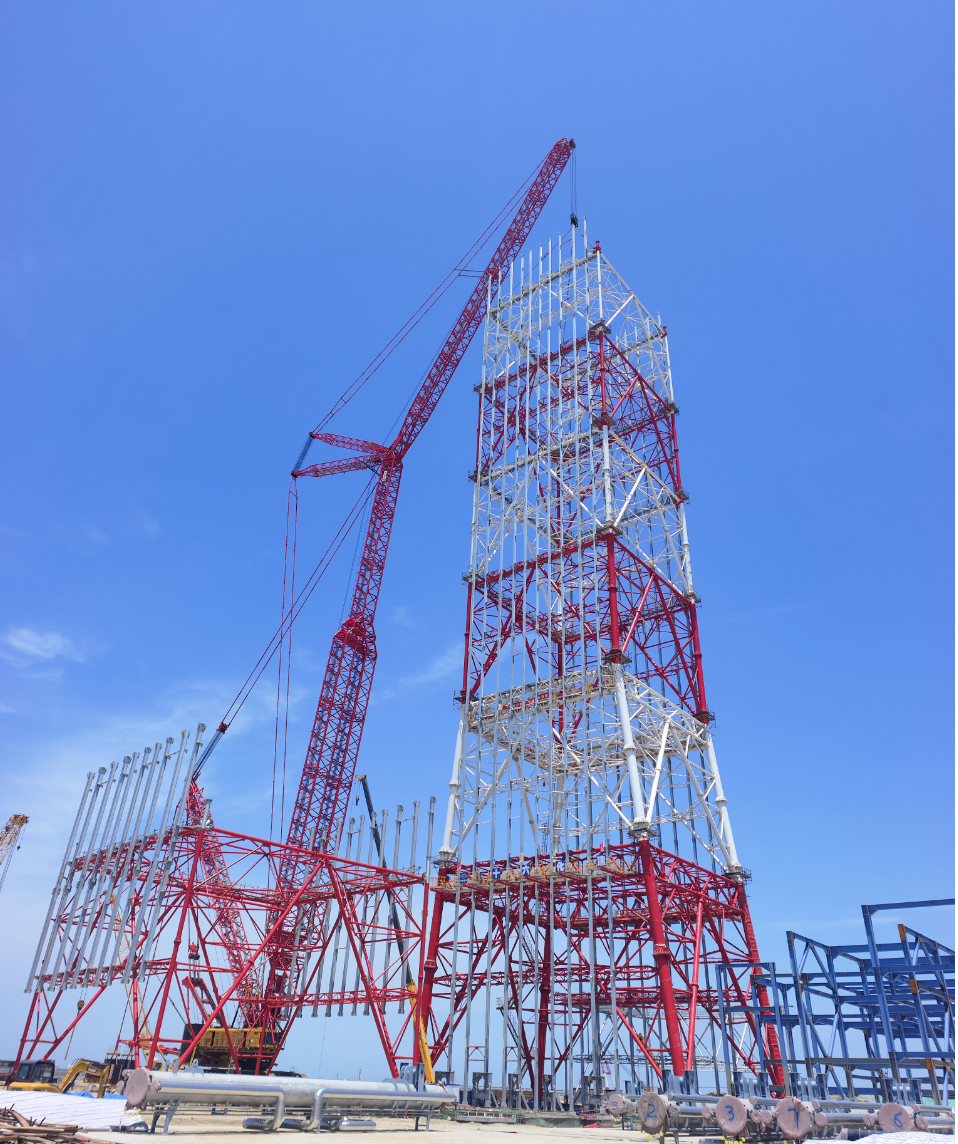 近日,在裕龙石化炼化一体化项目(一期)现场,山东海湾吊装工程股份有限公司的2000吨级履带起重机SCC20000A成功完成火炬塔架封顶。此次吊装的火炬塔架高168m,总重2100t,是目前全亚洲最高的火炬。