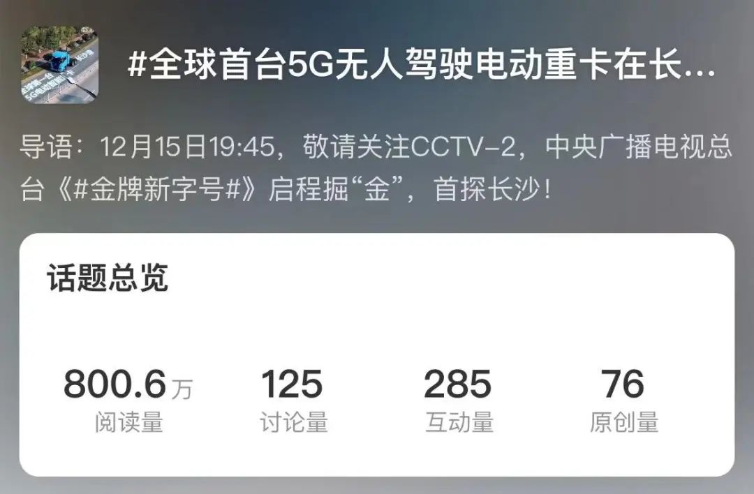 当天,由央视财经发起的微博话题#全球首台5G无人驾驶电动重卡在长沙#冲上微博热搜,累计阅读量超800万,让好体育投注官网重卡驶"出圈",走进广大公众视野。