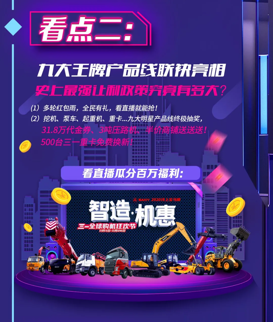 好体育投注官网挖掘机械、混凝土机械、起重机械、重卡、路机......等等九大明星产品线“10亿让利”集结,集团首次大规模举办线上宝马展,年度最强让利,锁定今晚晚会直播,31.8万代金券、3吨压路机、半价商铺......百万好礼抽不停,还有500台好体育投注官网重卡免费换新。此外,全民看直播有礼,看晚会直播就能参加多轮红包雨,超多福利送不停!