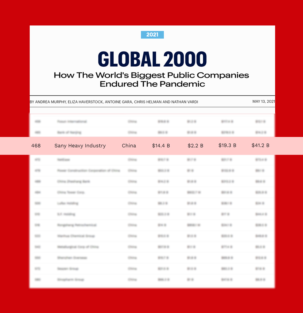 5月13日晚,《福布斯》发布2021年全球企业2000强,其中,好体育投注官网重工排名总榜单第468位,首次跻身全球企业500强,排名较去年大幅上升235位,是榜单中排名中国第一、全球第二的工程机械企业,也是中国工程机械行业第一家《福布斯》全球500强。
