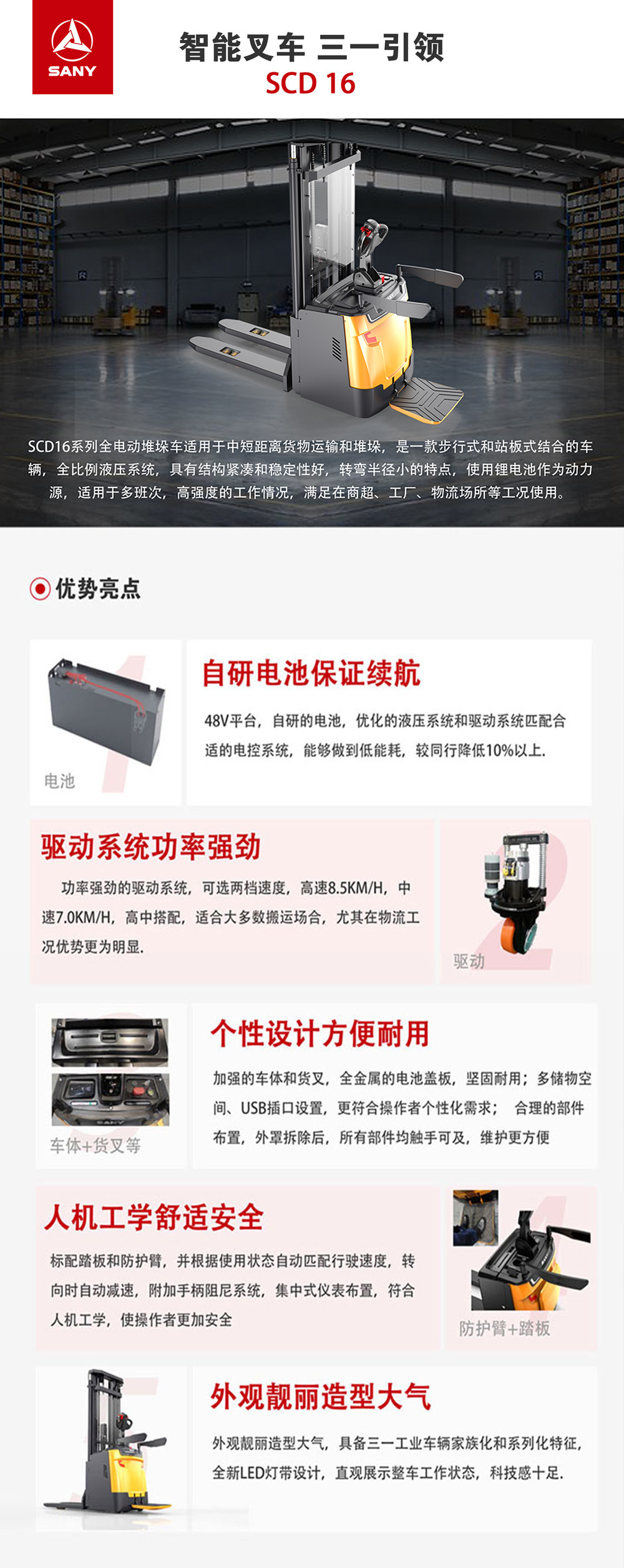 SCD16系列全电动堆垛车适用于中短距离货物运输和堆垛,是一款步行式和站板式结合的车辆,全比例液压系统,具有结构紧凑和稳定性好,转弯半径小的特点,使用锂电池作为动力源,适用于多班次,高强度的工作情况,满足在商超、工厂、物流场所等工况使用。