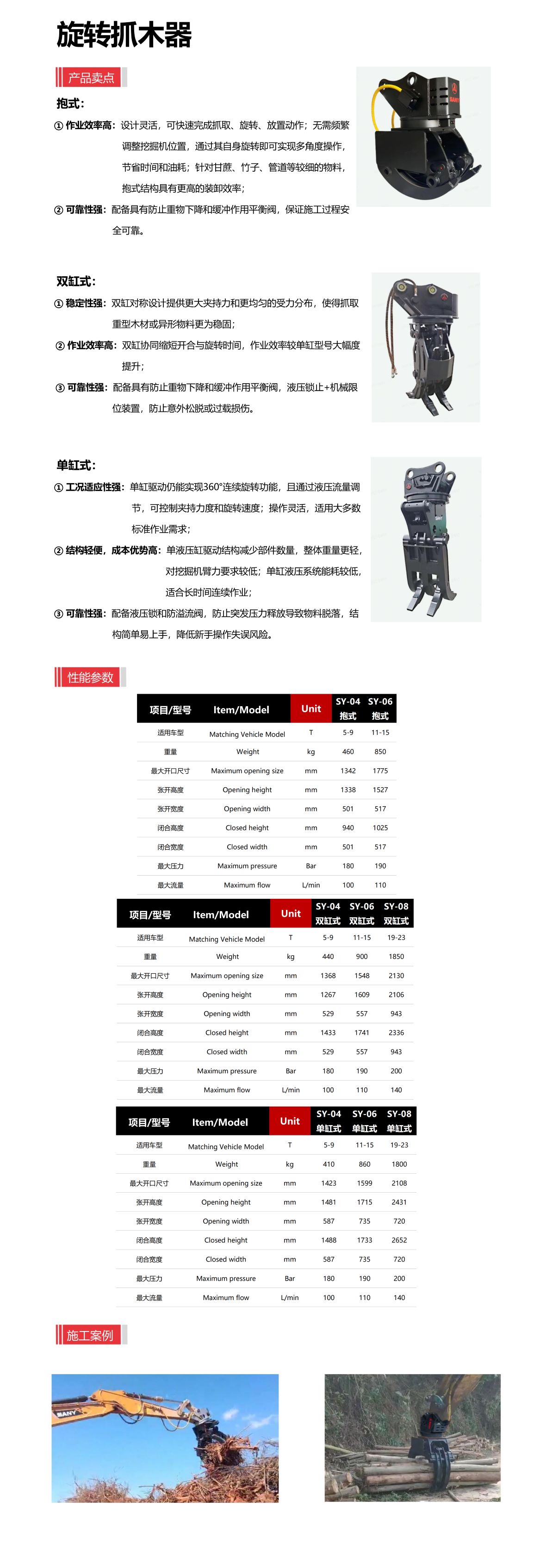 ① 工况适应性强:单缸驱动仍能实现360°连续旋转功能,且通过液压流量调节,可控制夹持力度和旋转速度;操作灵活,适用大多数标准作业需求;